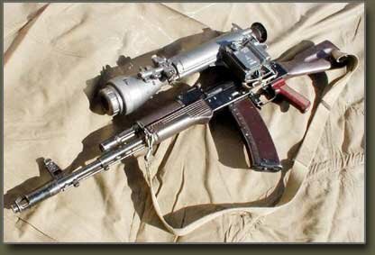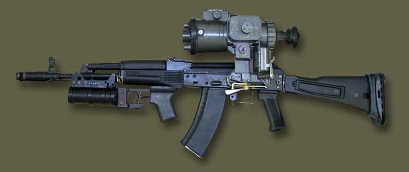 АК-74Н «Ночной» вариант с боковой планкой для крепления инфракрасных ночных прицелов. Магазины, первоначально изготавливаемые из оранжево-коричневого пластика, стали делать из черного пластика.
