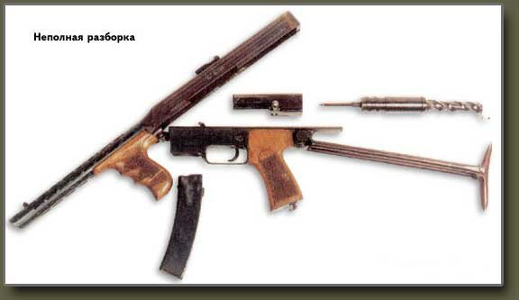 В 1947 г. Калашников спроектировал пистолет-пулемет 9-мм калибра, действующий по принципу отдачи свободного затвора. Капсюль разбивается бойком, жестко закрепленным в чашечке затвора. Спусковой механизм допускает ведение как одиночного, так и непрерывного огня. Переводчик одновременно выполняет функцию предохранителя, фиксируя затвор в переднем положении своим торцом или в заднем положении вырезом в средней части флажка. При установке на предохранитель флажок переводчика прикрывает паз для прохода рукоятки перезаряжания, расположенный в крышке ствольной коробки. Экстракция и отражение стреляной гильзы производятся с помощью выбрасывателя, смонтированного на затворе, и отражателя, жестко закрепленного на боковой стенке ствольной коробки. Патроны подаются из двухрядного коробчатого магазина, который используется при стрельбе в качестве дополнительной рукоятки для удержания пистолета-пулемета.