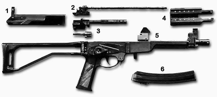 Пистолет-пулемет АЕК-918Г в неполной разборке: 1 — крышка ствольной коробки; 2 — возвратный механизм; 3 — затвор; 4 — ствольная накладка; 5 — ствол со ствольной коробкой, пистолетной рукояткой и прикладом; 6 — магазин.