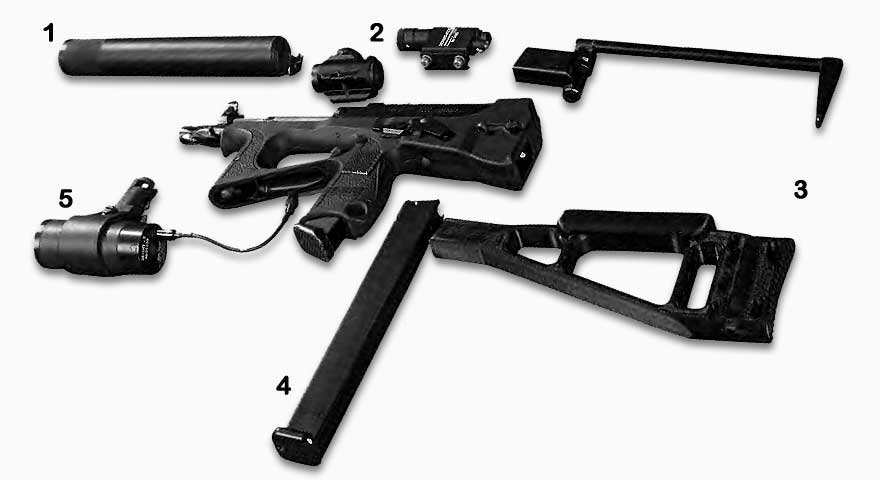 Пистолет-пулемет ПП-2000 с набором съемных приспособлений: 1 — глушитель; 2 — съемные прицелы; 3 — складной металлический и постоянный пластмассовый приклады; 4 — магазин увеличенной емкости; 5 — фонарь-осветитель.