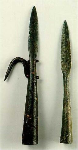 Для скрепления древка-ратовища с наконечником в тулее обычно делалось два круглых отверстия, в которые вбивались гвозди - загвоздки. Более древние копья 11 - 14 вв. были чрезвычайно разнообразны по величине и по форме: от плоских, листовидных, до узких, длинных, трех- и четырехгранных, наподобие жала. В раннюю пору копья с жаловидным острием встречаются гораздо реже и связываются археологами с культурами сибирских и финских народностей.