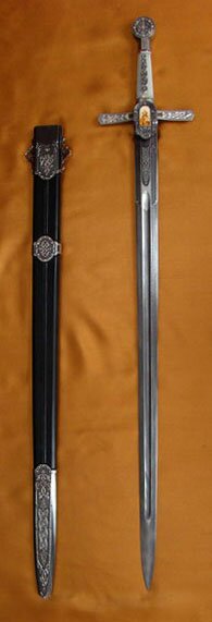 Ремни эти обычно покрыты бархатом, шелком и шиты золотом, а иногда украшены финифтью. К этому времени относится появление рыцарского оружия. Рыцарские мечи выделяются своей красотой, считаясь благородным оружием. В продолжение месяцев их оставляли лежать на алтарях, они участвовали в литургии, их благословляли священники и даже освящали. Лучшие хранились в сокровищницах монастырей под алтарями, на могилах своих бывших владетелей. Им дают имена, как это делалось еще во времена Каролингов; при инвеституре, короновании, посвящении они участвуют в церемонии в силу строго соблюдаемого завета. Их происхождению часто приписывали сверхъестественный характер; некоторые из них якобы обладали волшебными свойствами.